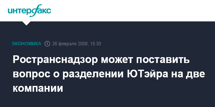 Москва. 26 февраля. INTERFAX.RU - Ространснадзор может поставить вопрос о разделении одного из крупнейших авиаперевозчиков РФ авиакомпании "ЮТэйр" на две компании, заявил глава ведомства Геннадий Курзенков на заседании коллегии федеральной службы во вторник.