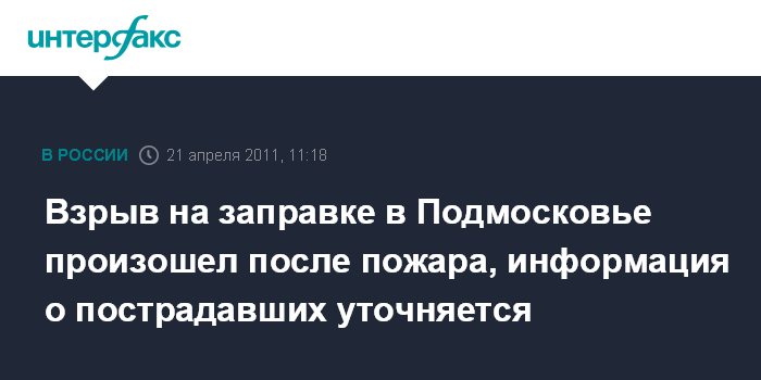 Москва. 21 апреля. INTERFAX.RU - Взрыву на газонаполнительной станции предшествовал пожар, сообщили "Интерфаксу" в пресс-службе ГУ МЧС по Московской области.