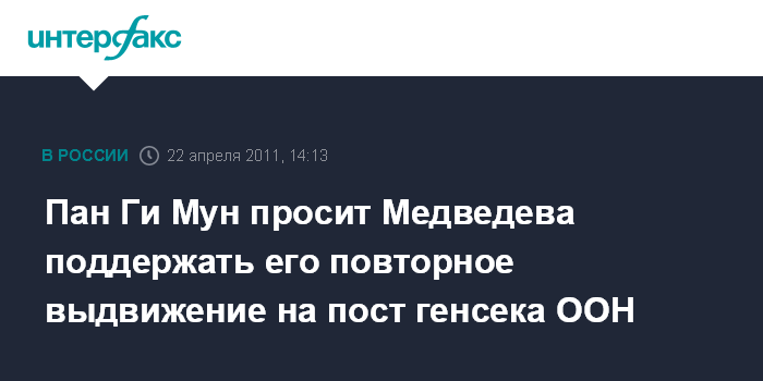 Горки. 22 апреля. ИНТЕРФАКС - Генсек ООН Пан Ги Мун обратился к главе российского государства Дмитрию Медведеву с просьбой поддержать вторичное выдвижение его кандидатуры на пост генерального секретаря ООН.