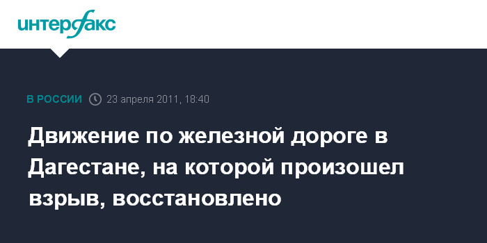Махачкала. 23 апреля. INTERFAX.RU - Движение по Махачкалинскому участку Северокавказской железной дороги, нарушенное в результате взрыва и обнаружения взрывных устройств, восстановлено, сообщили "Интерфаксу" в пресс-службе Главного управления МЧС России по Дагестану.