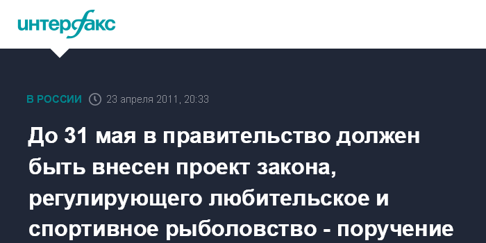 Москва. 23 апреля. ИНТЕРФАКС - Премьер-министр РФ Владимир Путин предложил Росрыболовству совместно с заинтересованными федеральными органами исполнительной власти и с участием органов исполнительной власти субъектов РФ, ассоциаций (союзов) и организаций рыбохозяйственного комплекса обеспечить подготовку проекта федерального закона, регулирующего любительское и спортивное рыболовство в РФ.