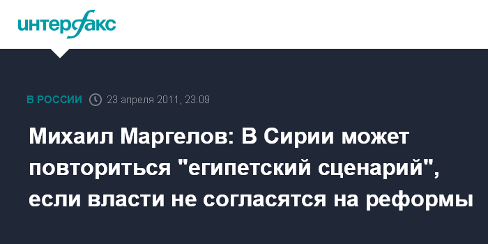 Москва. 23 апреля. ИНТЕРФАКС - Глава Комитета по международным делам Совета Федерации Михаил Маргелов считает, что промедление с реформами чревато для Сирии повторением "египетского сценария".