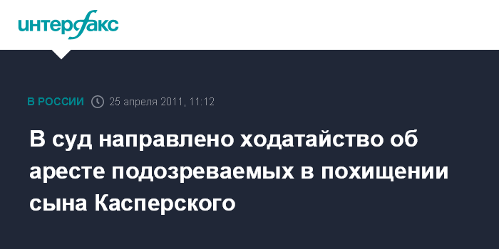 Москва. 25 апреля. ИНТЕРФАКС - Следственный комитет России ходатайствует перед судом об аресте подозреваемых в похищении Ивана Касперского - сына разработчика антивирусных программ Евгения Касперского, сообщил "Интерфаксу" официальный представитель СК РФ Владимир Маркин.