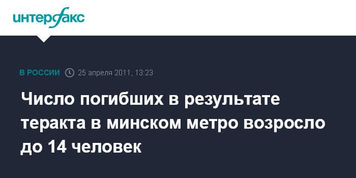 Минск. 25 апреля. INTERFAX.RU - В больнице скорой медицинской помощи в Минске в понедельник скончался еще один пострадавший в результате теракта в минском метро 11 апреля, общее число жертв взрыва достигло 14 человек.