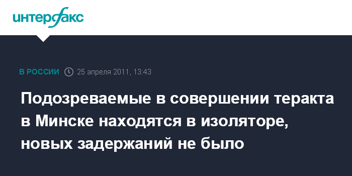 Минск. 25 апреля. INTERFAX.RU - Никаких новых арестов и задержаний, связанных с терактом 11 апреля в минском метро, не проводилось, заявляет глава МВД Белоруссии Анатолий Кулешов.