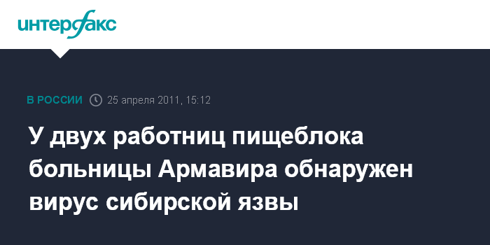Краснодар. 25 апреля. INTERFAX.RU - У двух работниц пищеблока городской больницы Армавира подтвердился диагноз "сибирская язва", сообщили агентству "Интерфакс-Юг" в пресс-службе управления МЧС РФ по Краснодарскому краю.