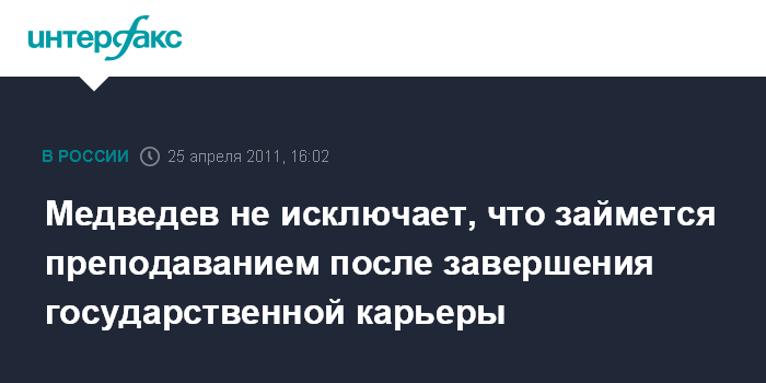 Москва. 25 апреля. INTERFAX.RU - Президент РФ Дмитрий Медведев не прочь быть преподавателем, в частности, в "Сколково" после завершения "государственной части карьеры".