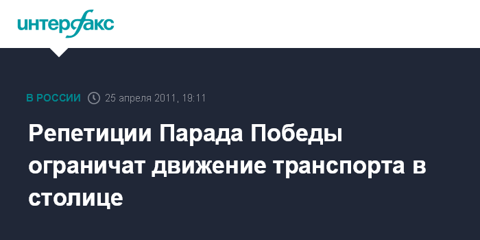 Москва. 25 апреля. INTERFAX.RU - В связи с проведением репетиций парада, посвященного Дню Победы, в Москве будет ограничено движение автотранспорта.