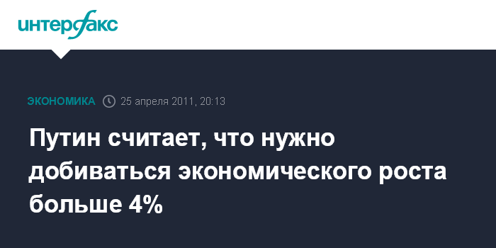 Москва. 25 апреля. INTERFAX.RU- Премьер-министр РФ Владимир Путин считает, что России нужно добиваться экономического роста больше 4%.