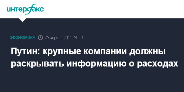 Москва. 25 апреля. INTERFAX.RU - Премьер-министр РФ Владимир Путин заявляет о необходимости раскрытия информации о структуре расходов крупнейших энергетических компаний.