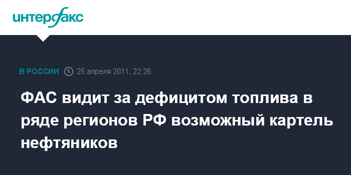Москва. 25 апреля. ИНТЕРФАКС - Дефицит нефтепродуктов, проявившийся в последние дни в ряде регионов России, мог возникнуть в результате картельного сговора нефтяных компаний, полагает глава ФАС РФ Игорь Артемьев.