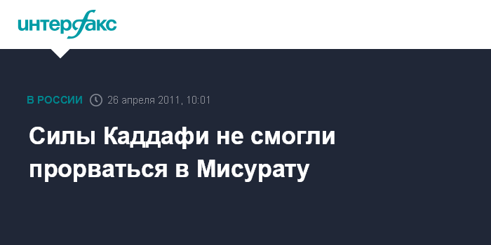 Париж. 26 апреля. INTERFAX.RU - Верные Муамару Каддафи военные попытались в понедельник прорваться в город Мисурата, на западе Ливии, однако потерпели неудачу, сообщают парижские СМИ.