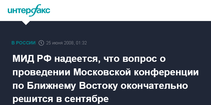 Москва. 25 июня. ИНТЕРФАКС - Глава МИД РФ Сергей Лавров надеется, что в сентябре наступит окончательная ясность в вопросе об организации Московской конференции по Ближнему Востоку.