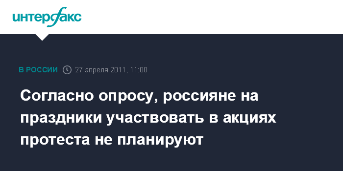 Москва. 27 апреля. INTERFAX.RU - Протестная активность россиян в преддверии Первомая находится на низком уровне, в первую очередь они хотят отдохнуть на майские праздники, показывают исследования социологов.