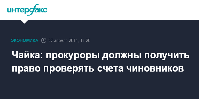 Москва. 27 апреля. INTERFAX.RU - Генпрокурор РФ Юрий Чайка считает, что органы прокуратуры должны быть наделены правом получать информацию о банковских счетах чиновников для проверки сведений об их доходах.