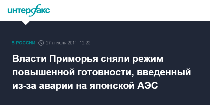 Владивосток. 27 апреля. INTERFAX.RU - В Приморском крае отменен режим повышенной готовности, действовавший в течение полутора месяцев в связи с аварией на японской АЭС "Фукусима-1".
