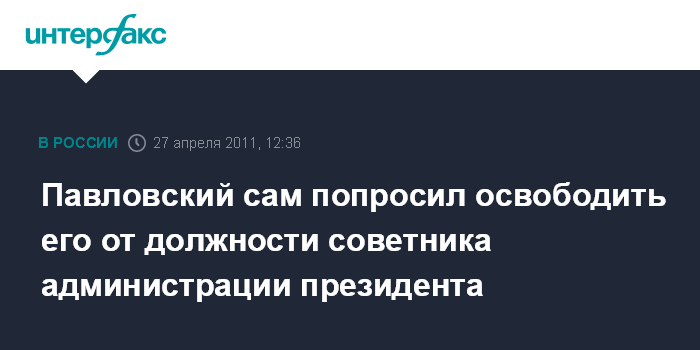 Москва. 27 апреля. INTERFAX.RU - В Кремле заявляют, что известный политолог Глеб Павловский был освобожден от должности советника администрации на общественных началах по его же собственной просьбе.