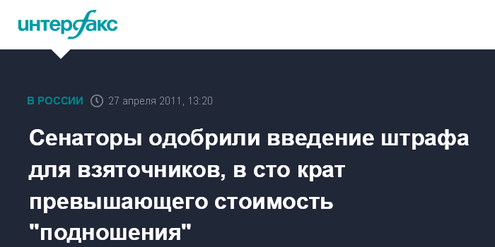 Москва. 27 апреля. INTERFAX.RU - Совет Федерации одобрил закон, согласно которому коммерческий подкуп или взятка могут наказываться штрафом, стократно превышающим сумму подкупа или взятки.