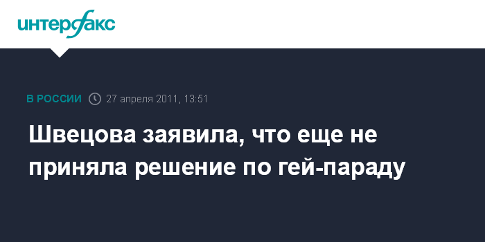 Москва. 27 апреля. INTERFAX.RU - Заместитель мэра в правительстве Москвы Людмила Швецова заявила, что не давала разрешения на проведение гей-парада в столице.