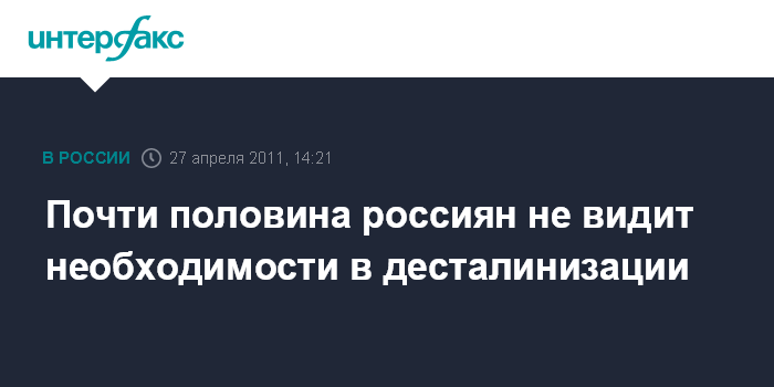 Москва. 27 апреля. INTERFAX.RU - Почти половина россиян (45%) считает, что десталинизация исковеркает историческое сознание, сделав его однобоким. Таковы данные опроса, проведенного ВЦИОМ 16-17 апреля в 46 регионах России.