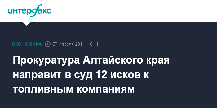 Барнаул. 27 апреля. INTERFAX.RU - Прокуратура Алтайского края направит в суд двенадцать исков к ОАО "Роснефть" и ОАО "Газпромнефть", ограничившим продажу ГСМ в регионе, сообщил агентству "Интерфакс-Сибирь" в среду начальник отдела по обеспечению участия прокуроров в гражданском и арбитражном процессе Евгений Панкратов.