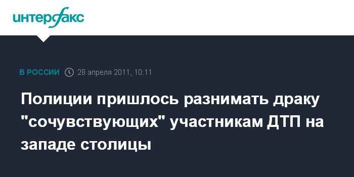 Москва. 28 апреля. INTERFAX.RU - ДТП на западе Москвы привело к потасовке между сторонниками двух водителей-участников аварии, сообщил "Интерфаксу" представитель Управления информации и общественных связей ГУВД Москвы.
