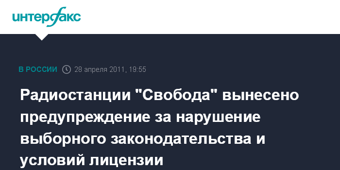 Москва. 28 апреля. INTERFAX.RU - Роскомнадзор подписал предупреждение радиостанции "Свобода" по жалобе, поступившей из Центральной избирательной комиссии, сообщил "Интерфаксу" в четверг официальный представитель ведомства Михаил Воробьев.