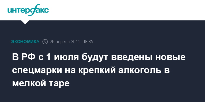 Москва. 29 апреля. INTERFAX.RU - В России с 1 июля 2011 года планируется ввести новые спецмарки для водки и другой крепкой алкогольной продукции в мелкой таре.