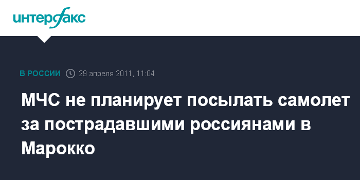 Москва. 29 апреля. INTERFAX.RU - МЧС РФ не планирует отправлять свой самолет со специалистами в Марокко, где в четверг в результате взрыва в кафе пострадали двое россиян, сообщили в пресс-службе ведомства.