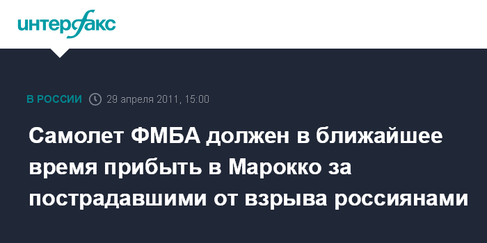 Москва. 29 апреля. INTERFAX.RU - Самолет Федерального медико-биологического агентства (ФМБА), который вылетел утром в четверг из Москвы в Марокко за россиянами, пострадавшими в результате взрыва в кафе в Марракеше, прибудет в Марокко около 15:00 мск, сообщили в пресс-службе ФМБА.