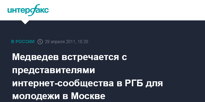 Москва. 29 апреля. INTERFAX.RU - Президент России Дмитрий Медведев проводит в пятницу встречу с представителями интернет-сообщества в Российской государственной библиотеке для молодежи в Москве.