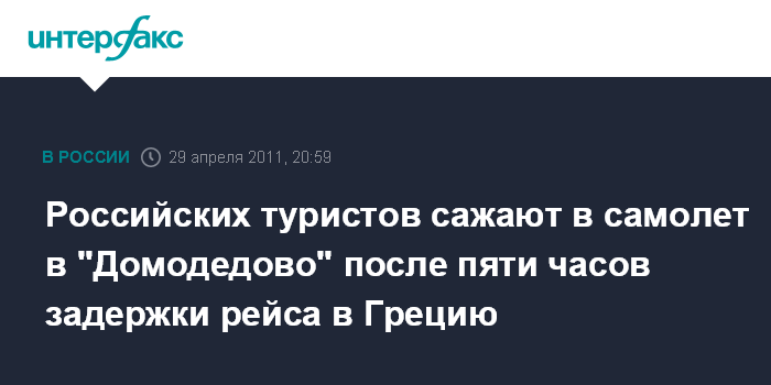 Москва. 29 апреля. INTERFAX.RU - Группу российских туристов пропустили на борт самолета в московском аэропорту "Домодедово", вылетающего на греческий остров Кос, сообщил "Интерфаксу" один из туристов.