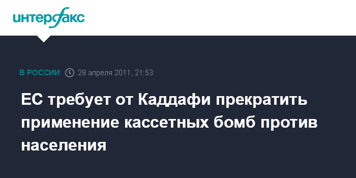 ЕС сильно обеспокоен сообщениями об использовании кассетных бомб против гражданского населения Ливии. Он призывает вооруженные силы М.Каддафи воздержаться от применения силы против мирных жителей, включая использование кассетных боеприпасов, а также других средств.