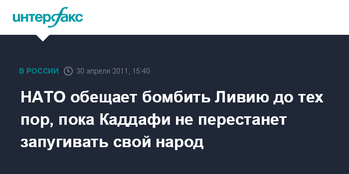 Рим/Брюссель. 30 апреля. INTERFAX.RU - Ливийский лидер Муаммар Каддафи должен перейти от слов к действиям, если он хочет урегулировать кризис, разразившийся в его стране, заявили в субботу в НАТО. "Мы ждем не слов, а действий", - заявил представитель альянса, высказывания которого приводят итальянские СМИ. Он предупредил, что НАТО продолжит наносить авиаудары по военным объектам в Ливии "до тех пор, пока не прекратится запугивание местных жителей".