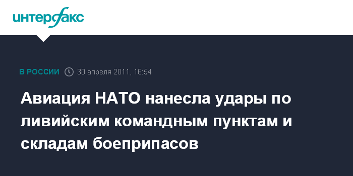Брюссель. 30 апреля. INTERFAX.RU - Основными целями ударов авиации НАТО по Ливии в минувшие сутки были командные пункты и склады боеприпасов, сообщается в субботу в очередной сводке командования операцией "Объединенный защитник"