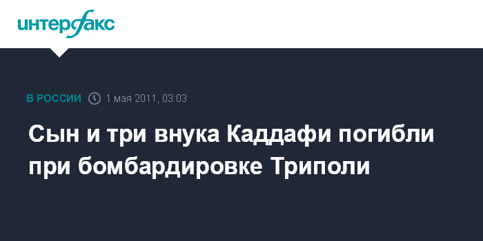 В результате авиаударов сам М.Каддафи не пострадал, но погибли также три его внука, сообщили также западные СМИ со ссылкой на данные правительства страны.