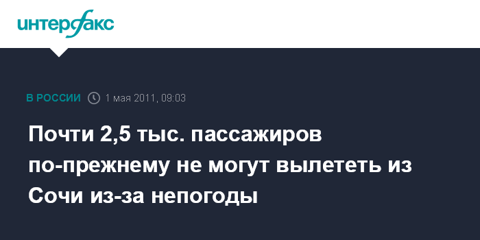 Сочи. 1 мая. ИНТЕРФАКС-ЮГ - Нелетная погода прогнозируется в первой половине дня воскресенья в Сочи, где вылета ожидают около 2,5 тыс. пассажиров.