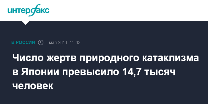 Токио. 1 мая. INTERFAX.RU - Национальное полицейское агентство Японии подтверждает гибель в результате разрушительного землетрясения и цунами 11 марта 14 тыс. 704 человек. Согласно отчету ведомства в воскресенье, список жертв за сутки пополнился 42 именами. Большая часть жертв стихии приходится на префектуры Мияги (8 тыс. 842 человека), Иватэ (4 тыс. 302 человека) и Фукусима (1 тыс. 496 человек).