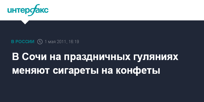 Сочи. 1 мая. INTERFAX.RU - Активисты молодежного парламента Сочи в центральном районе города-курорта проводят антитабачную и антинаркотическую акции. "Молодежь предлагает курящим людям конфеты в обмен на сигареты", - сообщил агентству "Интерфакс-Юг" куратор молодежного парламента Сочи Виктор Тепляков. Он отметил, что акцию "Поменяй сигарету на конфету" проводят члены молодежного парламента Сочи регулярно уже второй год.