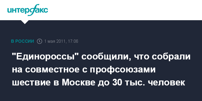 Москва. 1 мая. INTERFAX.RU - Около 30 тысяч человек приняли участие в майской демонстрации в Москве с участием "Единой России" и профсоюзов, сообщают в пресс-службе "Единой России". "По нашим данным, в Москве вместе с "Единой Россией" в демонстрациях участвовали столичные профсоюзы. Всего, по нашим данным, в акциях приняли участие около 30 тысяч человек", - сказали "Интерфаксу" в пресс-службе.