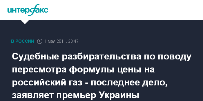 Киев. 1 мая. ИНТЕРФАКС - Киев рассчитывает добиться пересмотра формулы стоимости газа путем переговоров с Российской Федерацией, а не с помощью судов, заявляет глава украинского правительства Николай Азаров.