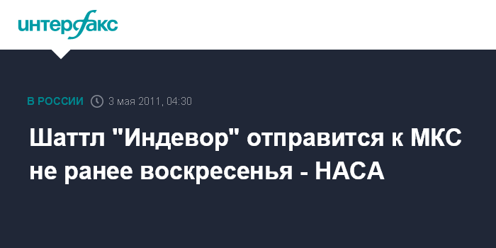 По информации агентства, старт шаттла, который не был осуществлен в прошлую пятницу из-за технических проблем, теперь намечается не ранее 8 мая. Руководители программы "Спейс шаттл" определят точную дату запуска корабля в ближайшие два дня.