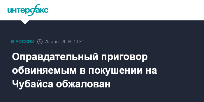 Москва. 25 июня. INTERFAX.RU - Генеральная прокуратура России обжаловала оправдательный приговор, вынесенный обвиняемым по делу о покушении на главу РАО ЕЭС Анатолия Чубайса.