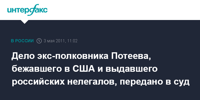 Москва. 3 мая. INTERFAX.RU - ФСБ России сообщает о завершении расследования уголовного дела в отношении бывшего полковника Александра Потеева, который выдал группу российских разведчиков-нелегалов, задержанных в США в прошлом году.