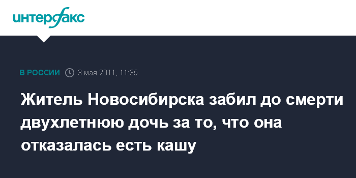 "32-летний глава семейства кормил девочку завтраком, попутно нанося ей побои, если та отказывалась есть кашу. Через некоторое время ребенок потерял сознание. После чего, по версии следствия, отец, желая скрыть преступление, положил ей в рот большой количество каши, чтобы казалось, что девочка сама подавилась", - сказала Кинжалова агентству "Интерфакс-Сибирь".
