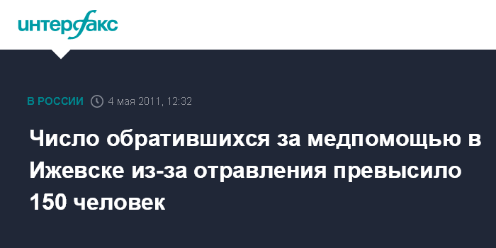 Как сообщалось ранее, по состоянию на вторник общее число граждан, пострадавших от массового отравления в Ижевске и обратившихся за медпомощью, составляло 123 человека. Таким образом, за день число пострадавших от отравления выросло на 30 человек.