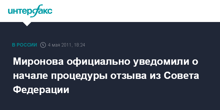 Санкт-Петербург. 4 мая. INTERFAX.RU - Спикеру Совета Федерации Сергею Миронову отправлено официальное уведомление о запуске процесса его отзыва из верхней палаты, сообщил "Интерфаксу" руководитель исполкома петербургского отделения "Единой России" Дмитрий Юрьев в среду.