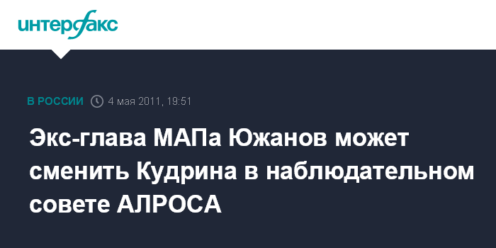 Москва. 4 мая. INTERFAX.RU - Преемником вице-премьера, министра финансов РФ Алексея Кудрина на посту председателя наблюдательного совета ОАО "АК "АЛРОСА" может стать экс-министр по антимонопольной политике РФ Илья Южанов, сообщил "Интерфаксу" источник в одном из профильных ведомств.