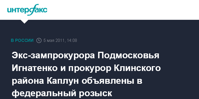 Москва. 5 мая. INTERFAX.RU - Бывший зампрокурора Московской области Александр Игнатенко и прокурор Клинского района Эдуард Каплун объявлены в федеральный розыск, сообщил в четверг в Басманном суде следователь СКР.