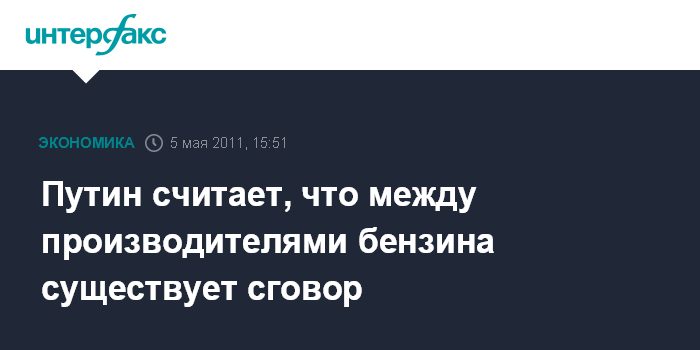Москва. 5 мая. INTERFAX.RU - Премьер-министр РФ Владимир Путин считает, что причина роста цен на бензин, возможно, лежит в сговоре компаний-производителей.